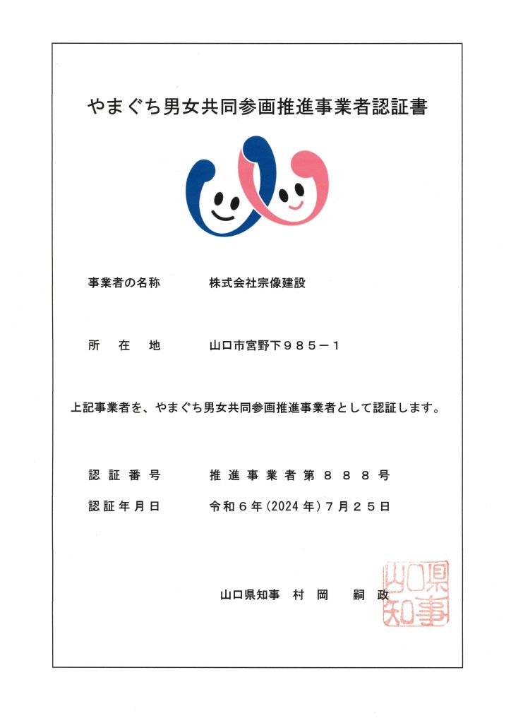 「やまぐち男女共同参画推進事業者認証書」を取得しました。